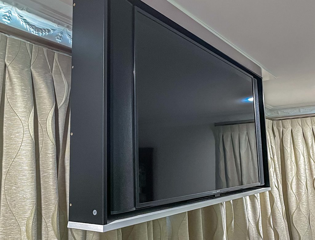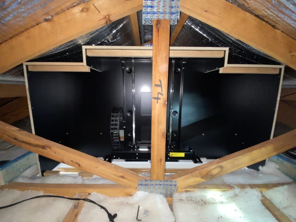 To achieve this vision, a custom made TV enclosure needed to be created and installed into the roof. The cabinetry required needed to fit a 55-inch TV. Once the custom cabinetry was mounted; a mechanism was installed allowing for free flowing up and down movement of the TV.